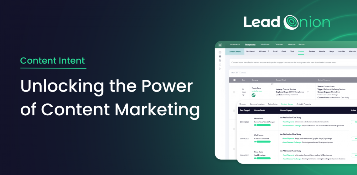 With Lead Onion's Content Intent tool you can get real-time insights on who is actively downloading content related to your industry, along with contact level data so you can engage with them promptly, delivering precisely what they're seeking.